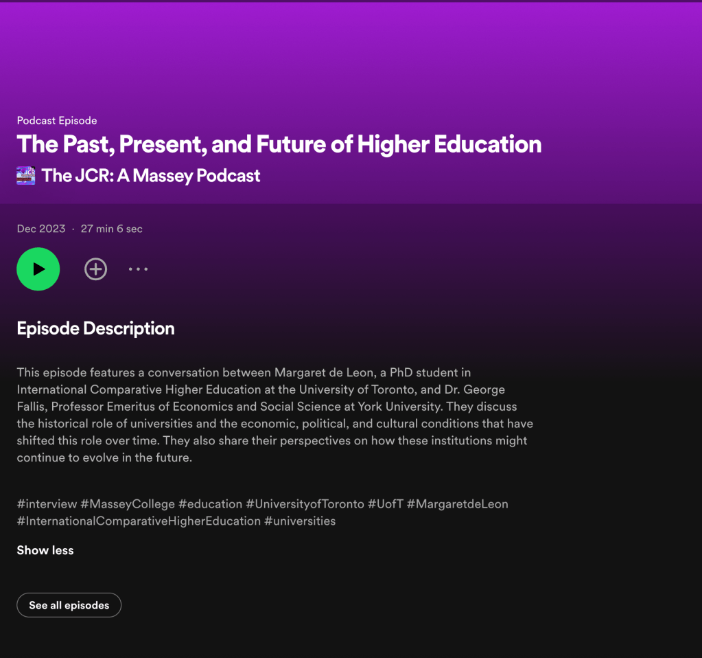 Collaboration with Dr. Wendy Cavendish and Dr. Deborah PerezMassey College, Junior Common Room (JCR) Podcast (November 2023-date)