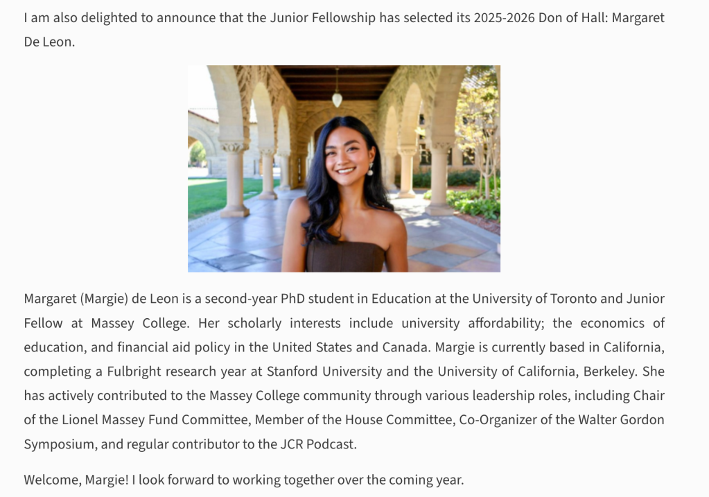 Massey College, University of Toronto (April 2025 to date)